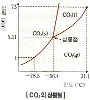 위 그래프는 CO2의 상평형을 보여주는데, CO2 녹는점은 압력 증가에 따라 증가한다. 가 액체상태로 존재하려면 압력이5.2atm을 넘어야 하고 바로 이런 점을 이용해서 고체 (드라이 아이스)는 편리한 냉각제로 사용된다. 드라이아이스는 대기압 하에서 액체 상태의 중간 형태를 거치지 않고 직접 승화하기 때문이다. 따라서 아이스크림 보관 등에 사용이 가능하다.